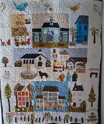 Et voici le projet précédent de Pascalinette, un village en France, terminé et quilté , elle a agrémenté les bandes de broderies ou d'appliqués.